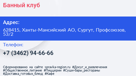 Банный клуб по адресу 628415, Ханты-Мансийский АО, Сургут, Профсоюзов, 53/2 в дальнейшем Организация, размещена в следующих категориях: