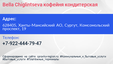 Bella Chiglintseva, кофейня-кондитерская по адресу 628405, Ханты-Мансийский АО, Сургут, Комсомольский проспект, 19 в дальнейшем Организация, размещена в следующих категориях: