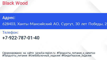 Black Wood по адресу 628403, Ханты-Мансийский АО, Сургут, 30 лет Победы, 21 в дальнейшем Организация, размещена в следующих категориях: