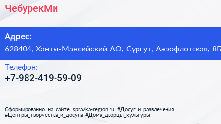 ЧебурекMи по адресу 628404, Ханты-Мансийский АО, Сургут, Аэрофлотская, 8Б в дальнейшем Организация, размещена в следующих категориях: