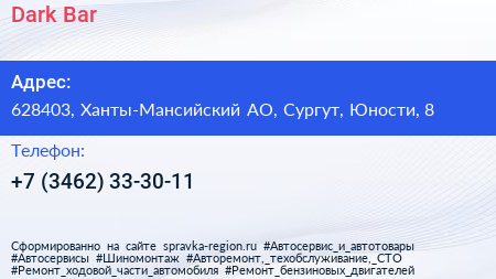 Dark Bar по адресу 628403, Ханты-Мансийский АО, Сургут, Юности, 8 в дальнейшем Организация, размещена в следующих категориях: