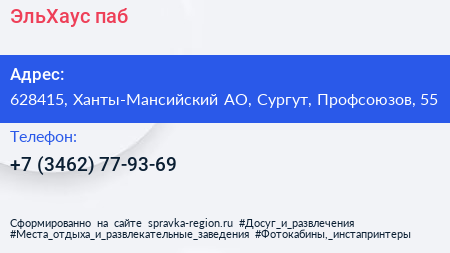 ЭльХаус, паб по адресу 628415, Ханты-Мансийский АО, Сургут, Профсоюзов, 55 в дальнейшем Организация, размещена в следующих категориях: