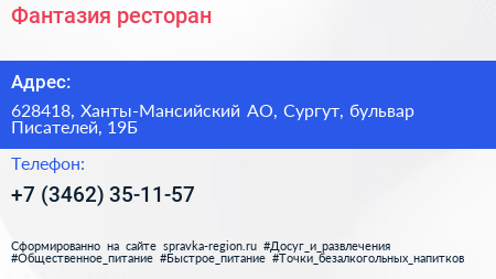 Фантазия, ресторан по адресу 628418, Ханты-Мансийский АО, Сургут, бульвар Писателей, 19Б в дальнейшем Организация, размещена в следующих категориях: