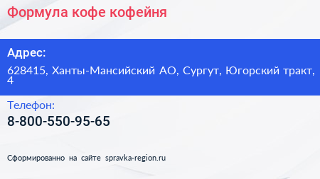 Формула кофе, кофейня по адресу 628415, Ханты-Мансийский АО, Сургут, Югорский тракт, 4 в дальнейшем Организация, размещена в следующих категориях: