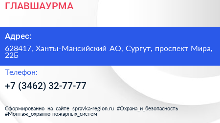 ГЛАВШАУРМА по адресу 628417, Ханты-Мансийский АО, Сургут, проспект Мира, 22Б в дальнейшем Организация, размещена в следующих категориях: