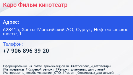 Каро Фильм, кинотеатр по адресу 628415, Ханты-Мансийский АО, Сургут, Нефтеюганское шоссе, 1 в дальнейшем Организация, размещена в следующих категориях: