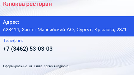 Клюква, ресторан по адресу 628414, Ханты-Мансийский АО, Сургут, Крылова, 23/1 в дальнейшем Организация, размещена в следующих категориях: