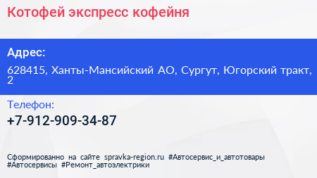 Котофей, экспресс-кофейня по адресу 628415, Ханты-Мансийский АО, Сургут, Югорский тракт, 2 в дальнейшем Организация, размещена в следующих категориях: