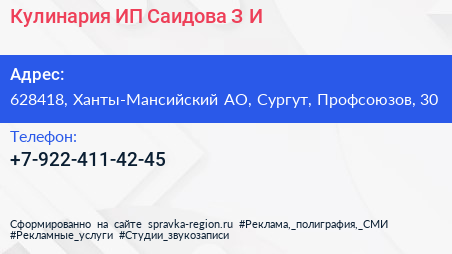 Кулинария, ИП Саидова З.И. по адресу 628418, Ханты-Мансийский АО, Сургут, Профсоюзов, 30 в дальнейшем Организация, размещена в следующих категориях: