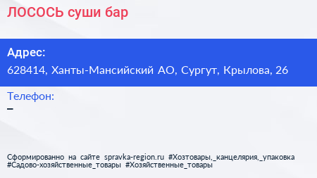 ЛОСОСЬ, суши-бар по адресу 628414, Ханты-Мансийский АО, Сургут, Крылова, 26 в дальнейшем Организация, размещена в следующих категориях: