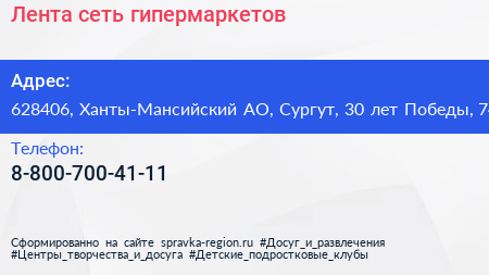 Лента, сеть гипермаркетов по адресу 628406, Ханты-Мансийский АО, Сургут, 30 лет Победы, 74 в дальнейшем Организация, размещена в следующих категориях: