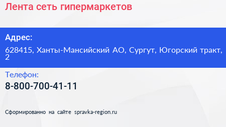Лента, сеть гипермаркетов по адресу 628415, Ханты-Мансийский АО, Сургут, Югорский тракт, 2 в дальнейшем Организация, размещена в следующих категориях: