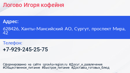 Логово Игоря, кофейня по адресу 628426, Ханты-Мансийский АО, Сургут, проспект Мира, 42 в дальнейшем Организация, размещена в следующих категориях: