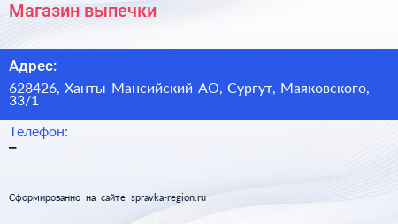 Магазин выпечки по адресу 628426, Ханты-Мансийский АО, Сургут, Маяковского, 33/1 в дальнейшем Организация, размещена в следующих категориях: