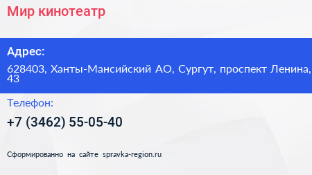 Мир, кинотеатр по адресу 628403, Ханты-Мансийский АО, Сургут, проспект Ленина, 43 в дальнейшем Организация, размещена в следующих категориях: