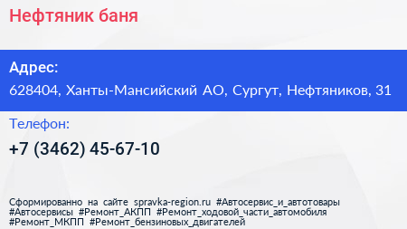 Нефтяник, баня по адресу 628404, Ханты-Мансийский АО, Сургут, Нефтяников, 31 в дальнейшем Организация, размещена в следующих категориях: