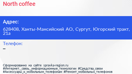 North coffee по адресу 628408, Ханты-Мансийский АО, Сургут, Югорский тракт, 21а в дальнейшем Организация, размещена в следующих категориях: