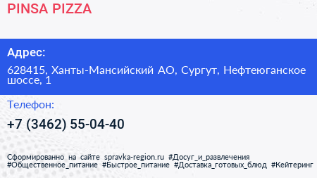PINSA & PIZZA по адресу 628415, Ханты-Мансийский АО, Сургут, Нефтеюганское шоссе, 1 в дальнейшем Организация, размещена в следующих категориях: