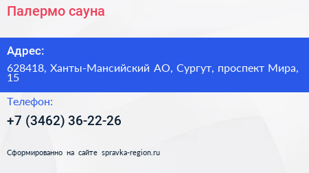 Палермо, сауна по адресу 628418, Ханты-Мансийский АО, Сургут, проспект Мира, 15 в дальнейшем Организация, размещена в следующих категориях: