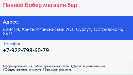 Пивной Бобер, магазин-бар по адресу 628418, Ханты-Мансийский АО, Сургут, Островского, 36/1 в дальнейшем Организация, размещена в следующих категориях: