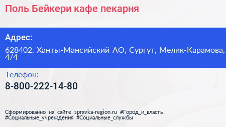 Поль Бейкери, кафе-пекарня по адресу 628402, Ханты-Мансийский АО, Сургут, Мелик-Карамова, 4/4 в дальнейшем Организация, размещена в следующих категориях: