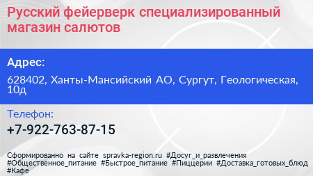 Русский фейерверк, специализированный магазин салютов по адресу 628402, Ханты-Мансийский АО, Сургут, Геологическая, 10д в дальнейшем Организация, размещена в следующих категориях: