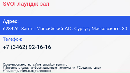 SVOI, лаундж-зал по адресу 628426, Ханты-Мансийский АО, Сургут, Маяковского, 33 в дальнейшем Организация, размещена в следующих категориях: