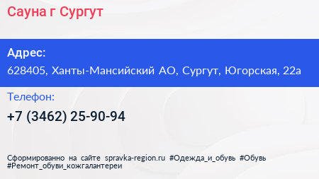 Сауна, г. Сургут по адресу 628405, Ханты-Мансийский АО, Сургут, Югорская, 22а в дальнейшем Организация, размещена в следующих категориях: