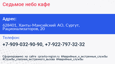 Седьмое небо, кафе по адресу 628401, Ханты-Мансийский АО, Сургут, Рационализаторов, 20 в дальнейшем Организация, размещена в следующих категориях: