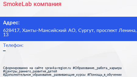SmokeLab, компания по адресу 628417, Ханты-Мансийский АО, Сургут, проспект Ленина, 13 в дальнейшем Организация, размещена в следующих категориях: