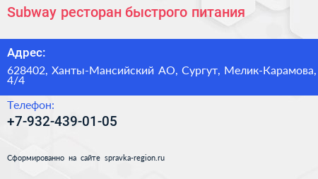 Subway, ресторан быстрого питания по адресу 628402, Ханты-Мансийский АО, Сургут, Мелик-Карамова, 4/4 в дальнейшем Организация, размещена в следующих категориях: