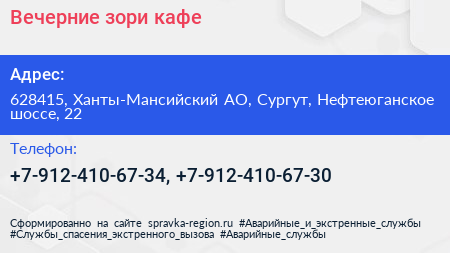Вечерние зори, кафе по адресу 628415, Ханты-Мансийский АО, Сургут, Нефтеюганское шоссе, 22 в дальнейшем Организация, размещена в следующих категориях:
