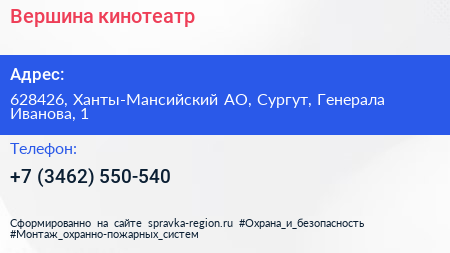 Вершина, кинотеатр по адресу 628426, Ханты-Мансийский АО, Сургут, Генерала Иванова, 1 в дальнейшем Организация, размещена в следующих категориях: