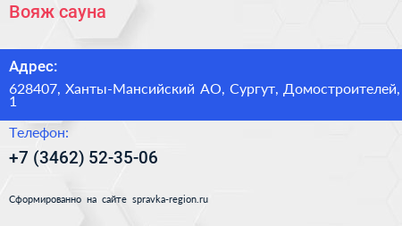 Вояж, сауна по адресу 628407, Ханты-Мансийский АО, Сургут, Домостроителей, 1 в дальнейшем Организация, размещена в следующих категориях: