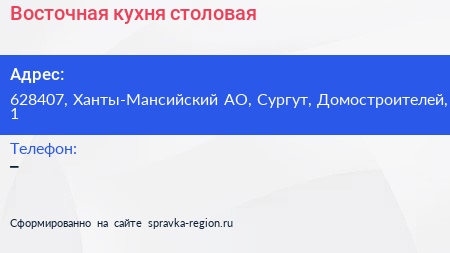 Восточная кухня, столовая по адресу 628407, Ханты-Мансийский АО, Сургут, Домостроителей, 1 в дальнейшем Организация, размещена в следующих категориях: