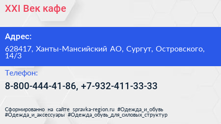 XXI Век, кафе по адресу 628417, Ханты-Мансийский АО, Сургут, Островского, 14/3 в дальнейшем Организация, размещена в следующих категориях: