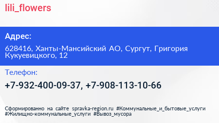 lili_flowers по адресу 628416, Ханты-Мансийский АО, Сургут, Григория Кукуевицкого, 12 в дальнейшем Организация, размещена в следующих категориях: