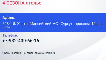 4 СЕЗОНА, ателье по адресу 628418, Ханты-Мансийский АО, Сургут, проспект Мира, 35/4 в дальнейшем Организация, размещена в следующих категориях: