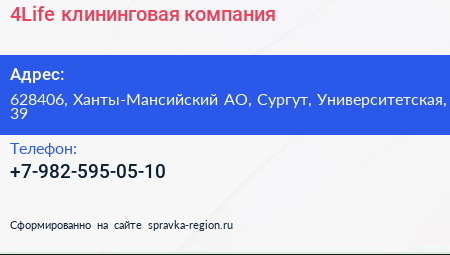 4Life, клининговая компания по адресу 628406, Ханты-Мансийский АО, Сургут, Университетская, 39 в дальнейшем Организация, размещена в следующих категориях: