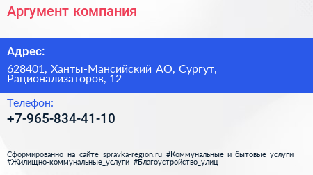 Аргумент, компания по адресу 628401, Ханты-Мансийский АО, Сургут, Рационализаторов, 12 в дальнейшем Организация, размещена в следующих категориях: