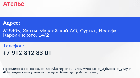 Ателье по адресу 628405, Ханты-Мансийский АО, Сургут, Иосифа Каролинского, 14/2 в дальнейшем Организация, размещена в следующих категориях: