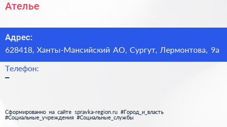 Ателье по адресу 628418, Ханты-Мансийский АО, Сургут, Лермонтова, 9а в дальнейшем Организация, размещена в следующих категориях: