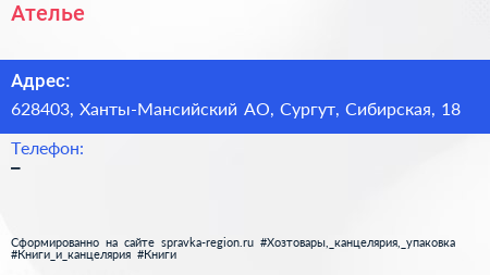 Ателье по адресу 628403, Ханты-Мансийский АО, Сургут, Сибирская, 18 в дальнейшем Организация, размещена в следующих категориях: