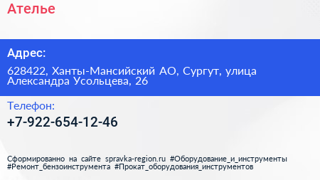 Ателье по адресу 628422, Ханты-Мансийский АО, Сургут, улица Александра Усольцева, 26 в дальнейшем Организация, размещена в следующих категориях: