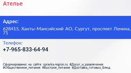 Ателье по адресу 628415, Ханты-Мансийский АО, Сургут, проспект Ленина, 71 в дальнейшем Организация, размещена в следующих категориях:
