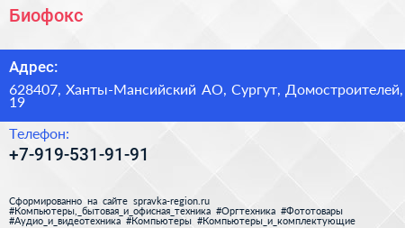 Биофокс по адресу 628407, Ханты-Мансийский АО, Сургут, Домостроителей, 19 в дальнейшем Организация, размещена в следующих категориях:
