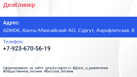 ДезКлинер по адресу 628404, Ханты-Мансийский АО, Сургут, Аэрофлотская, 8 в дальнейшем Организация, размещена в следующих категориях:
