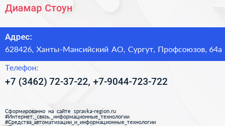 Диамар Стоун по адресу 628426, Ханты-Мансийский АО, Сургут, Профсоюзов, 64а в дальнейшем Организация, размещена в следующих категориях: