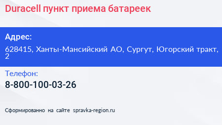 Duracell, пункт приема батареек по адресу 628415, Ханты-Мансийский АО, Сургут, Югорский тракт, 2 в дальнейшем Организация, размещена в следующих категориях: