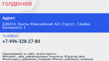 ГОЛДЕН КЕЙ по адресу 628414, Ханты-Мансийский АО, Сургут, Семёна Билецкого, 1 в дальнейшем Организация, размещена в следующих категориях: